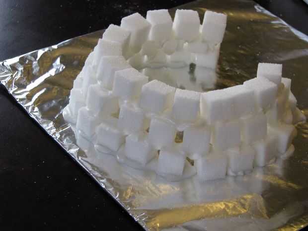 Como vas en pila los terrones de azúcar encima de la otra y como vas más mover los cubos de hielo un poco a la mitad por lo que se parece más a un iglú.