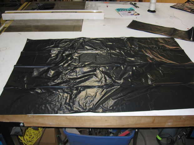 Para este proyecto necesitas: unas bolsas de basura jumbo (6 en este caso), alguna cinta, algunos objetos pesados y un ventilador de la caja. Tenga en cuenta que una hoja de trabajo en lugar de las bolsas de basura. Aunque ya que queríamos que fuera más grande, la hoja no era lo suficientemente grande.