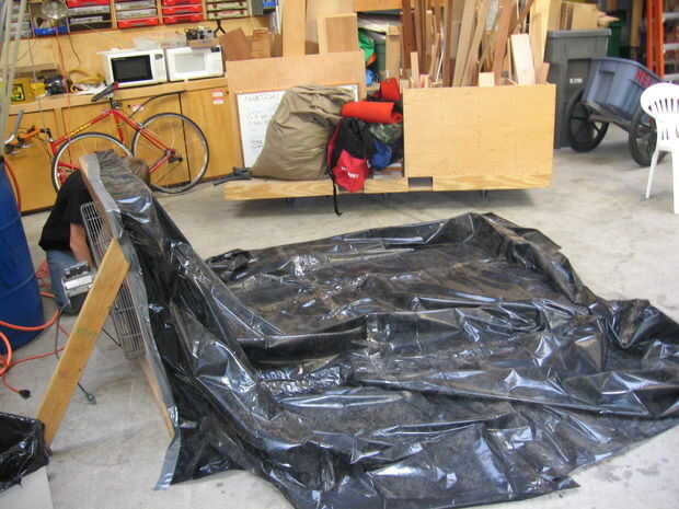 a continuación, necesitará cinta adhesiva un extremo del plástico todo alrededor de la caja del ventilador. Entonces usted necesita sujetar el plástico al suelo. Tratamos de usar cinta adhesiva, pero el piso estaba muy sucio, para que no se pegue. Así, encontramos piezas de madera (2 x 4 debe hacer) y otros objetos pesados para poner a los lados. Es importante mantener cierta holgura en el centro por lo que puede inflar.