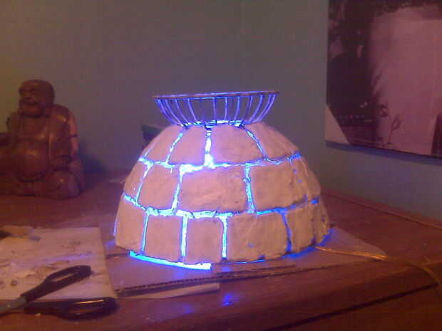 Pegamento de la base del pop puede en un ángulo de la cartulina para que todo encaje con el iglú encima de ella. Añadir algunos soportes de cartón a los lados y ahí ir. Gire a la luz y sus luces de apagado. Y el iglú encima de la luz... TA Da.
