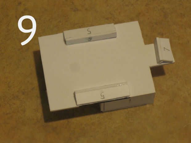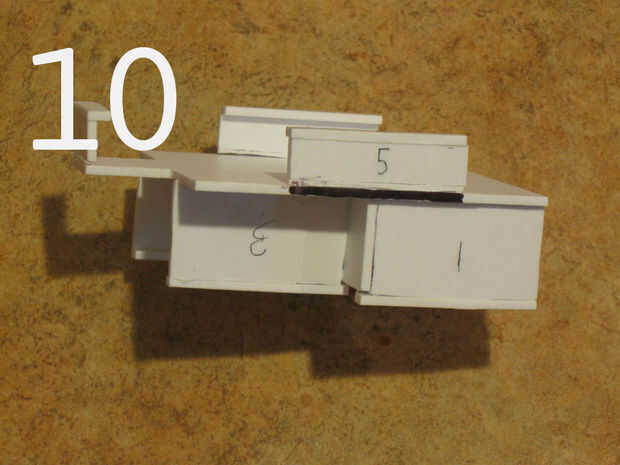 9: voltee la parte principal de la montura. Pegamento 5 y 6 final-en pieza 10, para que se sienta al lado de la marca.