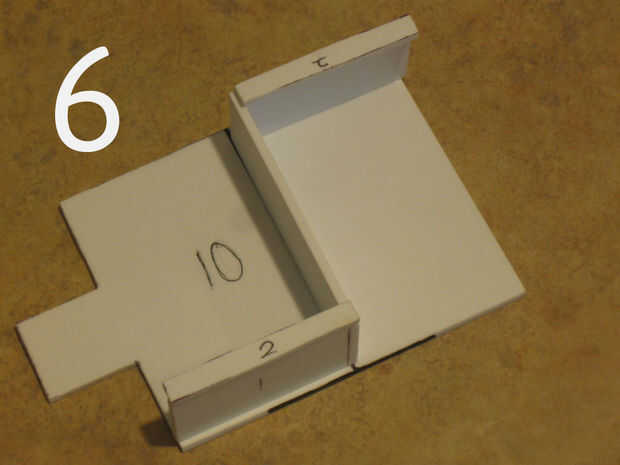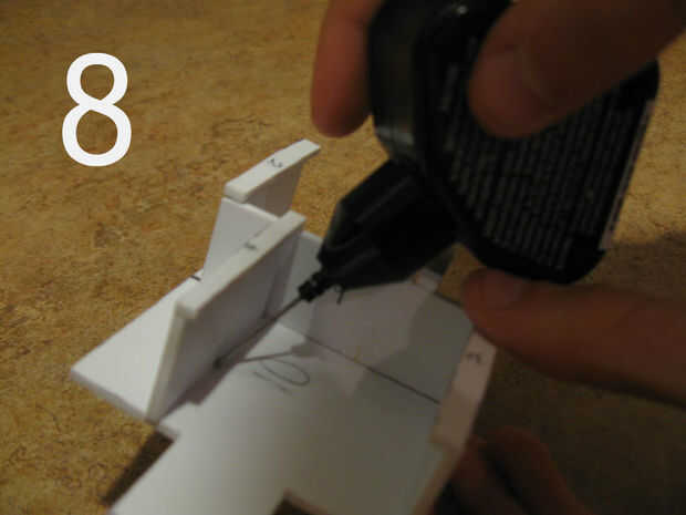 6: tomar pieza 10 y línea de pieza 9 a lo largo de la línea central que marcó anteriormente. Pegamento abajo, junto con la combinaciones de 1 y 2.