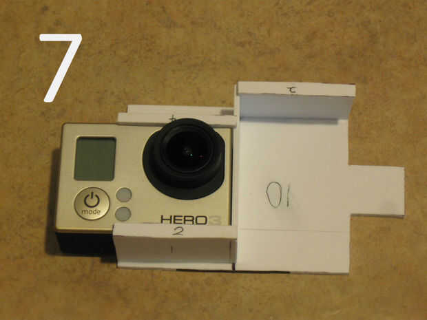 7: agarrar a uno de tu GoPro y ponerlo a donde irá cuando se realiza el montaje. Marque una línea en el borde del GoPro donde irá una combinación de 3 y 4. Hacer esto para ambas posiciones. Eliminar su GoPro una vez que haya marcado.