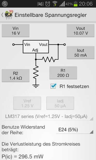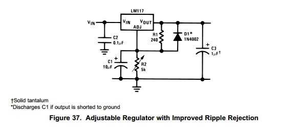 En mi caso ambos no funciona muy bien. La solución simple es utilizar un regulador de voltaje como el bien conocido LM317. Este IC viene con rechazo de rizo muy alta y es realmente fácil de manejar. He utilizado el circuito de la hoja de datos que se muestra arriba y simplemente cambia los valores de R1 y R2 a los valores necesarios para convertir mi adaptador de red de 16V salida a 10V fijos (usted puede elegir otras gamas). Puede utilizar fórmulas para los cálculos, varias calculadoras en internet, o utilizar una aplicación de android como lo hice. Los valores de resistencia son R1 = 200 y R2 = 1400. La disipación de energía será alrededor de 300 MW, pero eso es según el datasheep absolutamente en la gama en un ambiente temperator de ~ 25° C.
