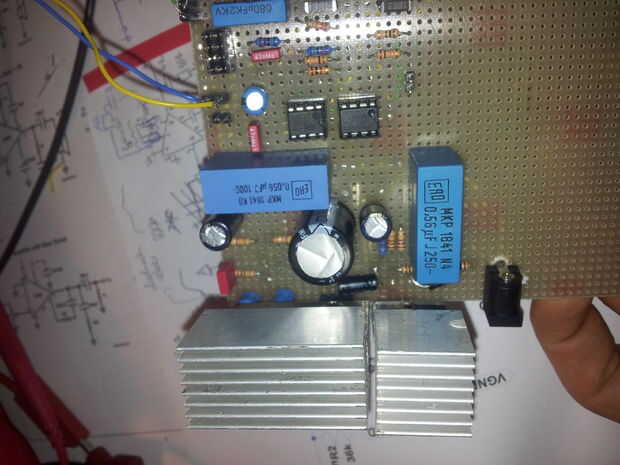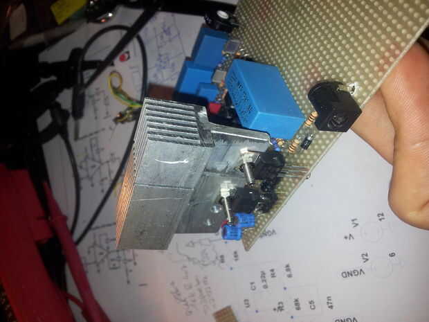 Porque reconocí algo de calor en el LM317 y el opamp L165 conecté dos disipadores de calor de vieja a los pines del ICs. Un error que hice aquí fue construyendo el ICs al lado del otro, con la idea de conectar ambos al mismo disipador térmico. Pero que cortocircuito el circuito! Así que asegúrese de que no hay ninguna conexión eléctrica entre ambos disipadores de calor. Sin embargo ambos disipadores de calor al lado de uno ven bastante bien para mí, así seguí de esa manera.