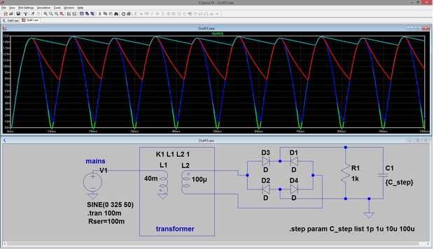 Pero como ya mencioné: adaptadores corriente baratos pueden ser una fuente adecuada para algunos motores o LED, pero no para circuitos de audio. La foto de arriba muestra una combinación de dos inductores en la configuración del transformador (230V_rms--> AC ~ 16V) y un puente rectificador para obtener el valor absoluto = 100 Hz rectificada sinusoide. Cuando la resistencia R1 es una resistencia de carga fija, sólo el tamaño del condensador pisos la curva a una tensión casi continua. Pero ese "casi" es el problema. Incluso si la capacitancia es muy alta (por ejemplo 100uF o superior) la tensión de alimentación contiene este zumbido de 100Hz (y armónicos).