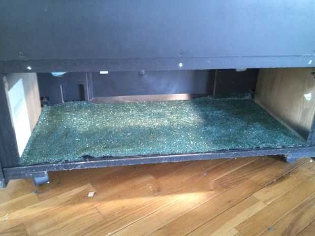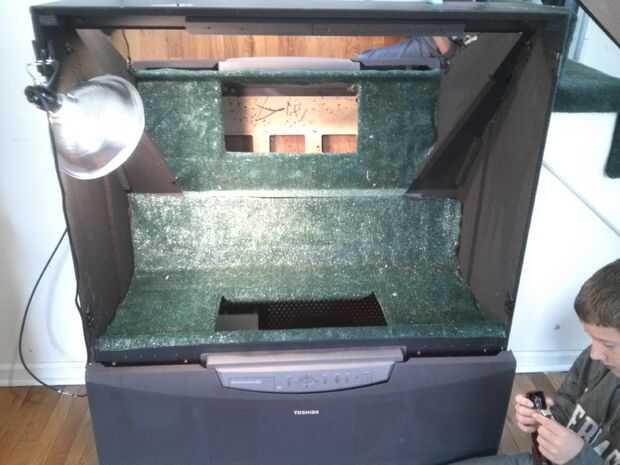 A continuación he encontrado algunos interiores alfombra de puerta que había utilizado en otro proyecto y cortar para adaptarse a la televisión. Decidí usar la parte superior y la parte inferior de la tv. La mitad superior para tomar y mostrar y el fondo para la alimentación y agua.
