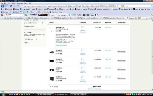 Te necesito tanto una zona de dormitorio y una zona de escritorio para mis estudios. Después de navegar por la Web IKEA , me enamoré con la colección Hemnes . Me gustaría conseguir una cama como actualmente sólo tengo un colchón en un marco de metal estándar. La reina Cama Hemnes sería genial. Voy a ser volver a la rutina de la escuela pronto, así que necesitaré espacio de trabajo adecuado. Mi escritorio antiguo es soplado lejos por la Mesa Hemnes . La lámpara de pie de barómetro sería grande para los esfuerzos de la noche. Por supuesto, el Hemnes Add On proveen opciones de almacenamiento excelente para ayudar a mantenerme organizado. También necesitaré un lugar para guardar mi ropa. El Pecho de cajones Hemnes 3 es perfecto porque voy a tener una buena cantidad de espacio en el armario.