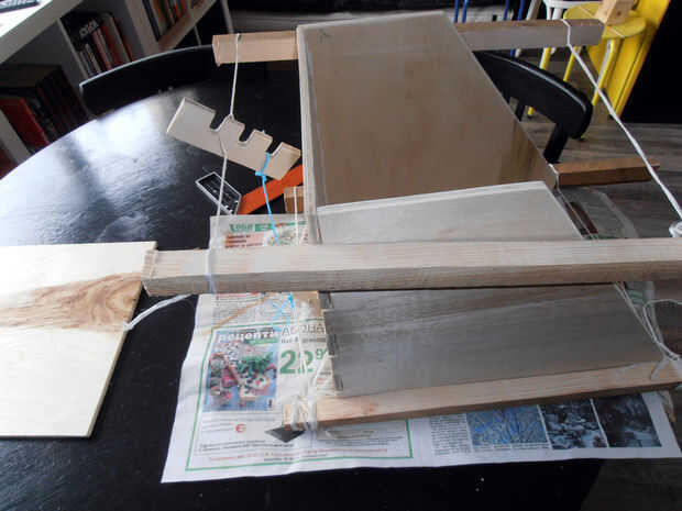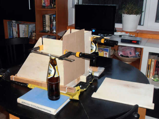 Aquí necesitarás pinzas largas. Disponemos de abrazaderas de tiempo suficiente para que esto así que improvisamos un poco. Puedes hacerlo también - uso algunos pedazos de madera y la cuerda y la cuerda de la torcedura hasta llegar las piezas bien afianzado con abrazadera. Pobre hombre abrazaderas trabajo suficiente para madera contrachapada.