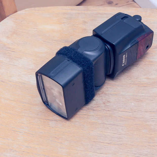 Le he puesto velcro en difusor y flash - es útil para otros accesorios también (color gel, alguien?) - para ver fotos de la config del velcro.