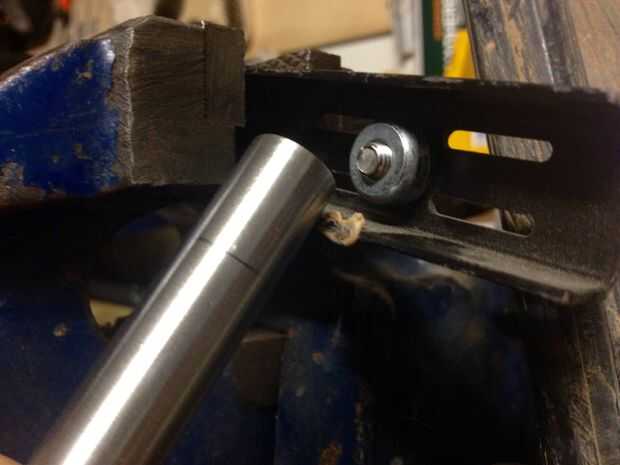 Para sacarlos hacia fuera podría cortar el tubo y los martillo de de atrás, pero yo prefiero fijar el tornillo a través de un punto fijo y tire. En este caso se fija a un carril de sobras estante que he afianzado con abrazadera en un vicio, pero bastará cualquier broca de metal con un agujero en él.