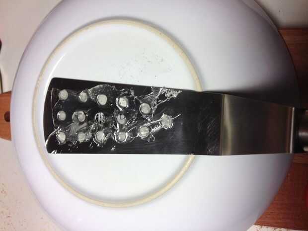 3. Añadir la espátula de tazón de fuente a la tabla de cortar y pegamento