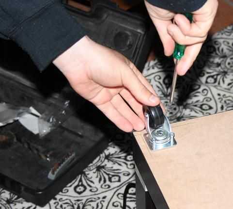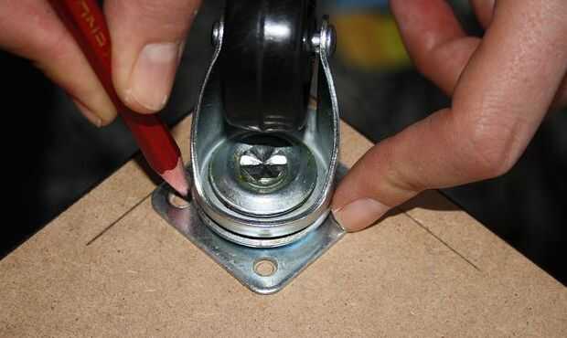 Mida y marque la colocación de las ruedas. Les puse que la placa base de ricino fue 1 cm de los bordes de la base. Esto es porque no quería que las ruedas poco sobresalga demasiado debajo de la mesa que se movía. Tenga cuidado, sin embargo, porque como se ve en este Instructable por thebunnykingofnowhere, la esquina bloquear dentro de la tapa de la falta de unos 6cm cuadrado.
