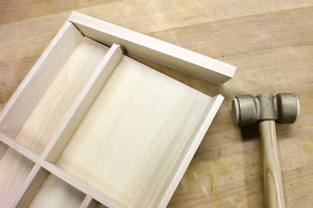 Usando un martillo de cara suave y sacando el extremo de la bandeja de cubiertos fue capaz de separar el intento. El pedazo de extremo fue pegado y con tachuelas juntas usando clavos y se rompió aparte fácilmente.