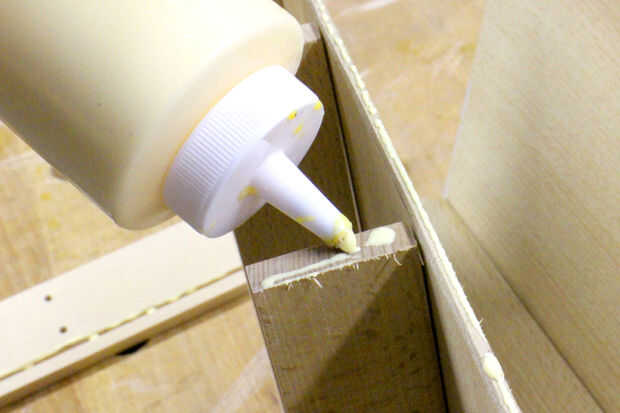 Una gota de pegamento de madera se colocó en los bordes nuevos de corte y la pieza final fue unida a los cubiertos utilice acabado unos clavos.