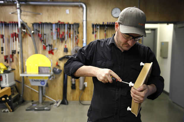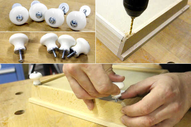Usando un taladro con una broca un poco más pequeño que los tornillos usados en las asas, las aberturas se realizaron en cada esquina en la parte inferior de la bandeja de cubiertos. Los tiradores luego se atornillan en las aberturas.