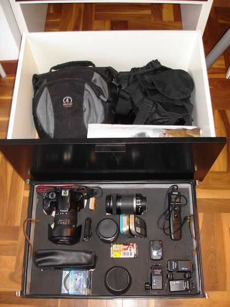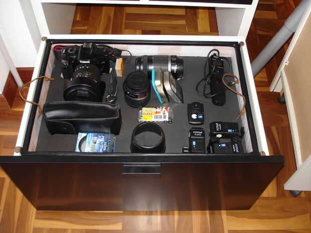 Fotos 2 y 3 muestran lo que se me ocurrió: equipo de cámara y bolsas arreglado para arriba y fuera de la vista!