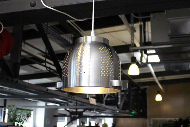 IKEA tiene un montón de cosas que se pueden convertir en luces atractivas. Me encantó el look industrial del colador de acero inoxidable, y convirtiéndose en una lámpara fue una brisa con sistema de luz toma de Hemma barato de IKEA.