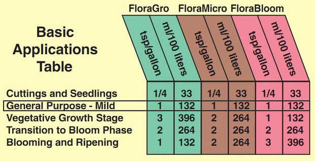 El "propósito general" proporción de la mezcla (ver crecer gráfico) de 1:1:1 para los tres componentes se utiliza. Esto significa mezclar 1,32 ml de cada uno de los componentes por cada litro de agua.