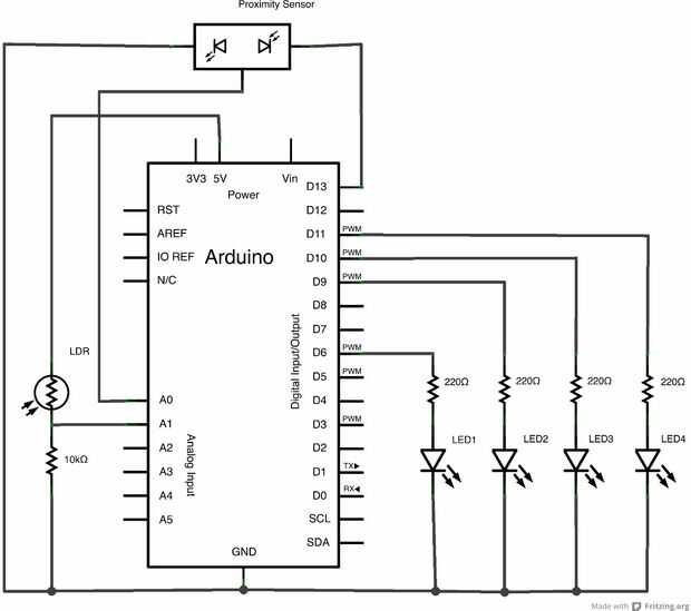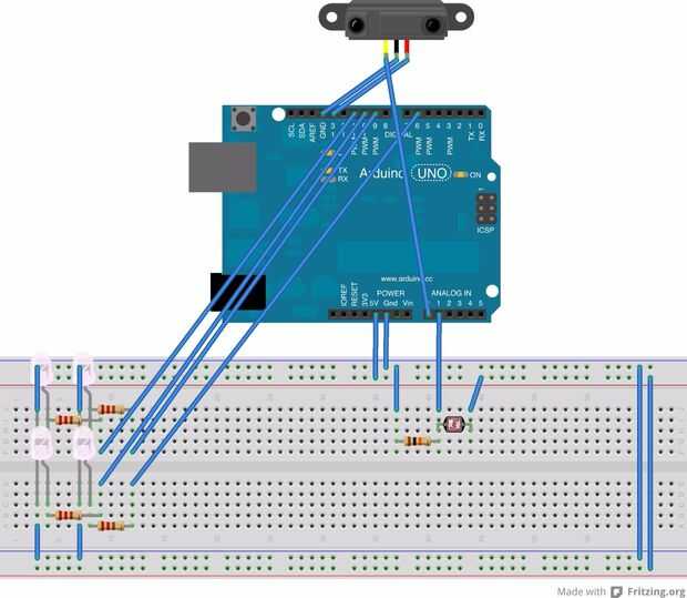 Comenzar preparando el LV-EZ0. Un encabezado hembra 7 polos a través de los agujeros de la soldadura. Usaremos solo 3 de estos pines: GND, + 5, y pueblo el protoboard según el diagrama pictórico y esquemático. Usé un protoboard y jumper cables en contraposición a los componentes de un taladro pasante de soldadura Junta debido a la simplicidad del circuito. Cuando realice el cableado del LV-EZ0, use cables lo suficientemente largos para que el sensor puede empujar hacia fuera la parte superior de la pantalla.