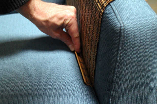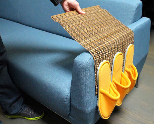 Cuelgue del brazo de su sillón o silla de la estera de bambú. Dependiendo del estilo de su sofá puede meter el extremo de la esterilla de bambú entre el cojín del sofá y el brazo de añadir un anclaje seguro. De lo contrario, debe haber suficiente fricción de la estera para sostenerse en el brazo sin meter en el cojín.