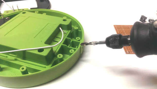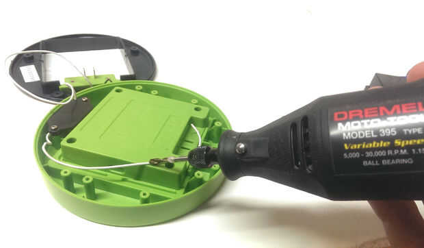 A continuación, obtener su dremel herramienta hacia fuera y permite hace espacio para nuestro botón de switch SPST. Utilizando la dremel, agrande el orificio que asomaba la columna metálica que o tornillos botón SPST. A continuación, cuatro agujeros de 5mm dremel, uno a cada lado y dos en la parte superior. Asegúrese de que las puntas de los LEDs Acomódesela en los agujeros.