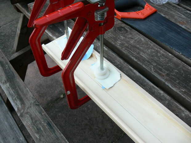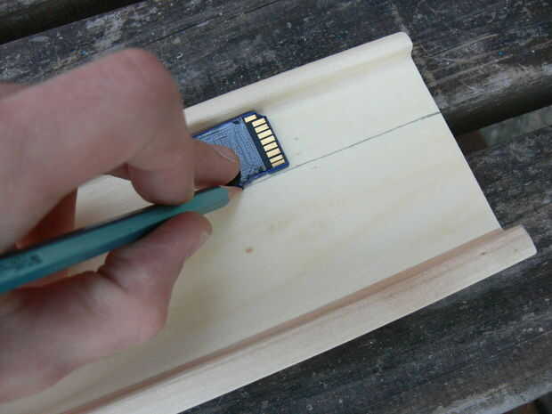 Marque una línea de corte en el estante superior. Me pareció una vieja tarjeta SD solo el ancho adecuado. Fijarlo con la abrazadera, luego se corta eso mofo!