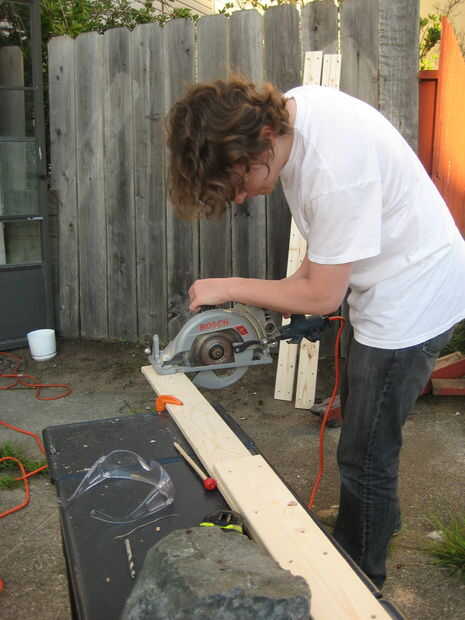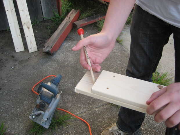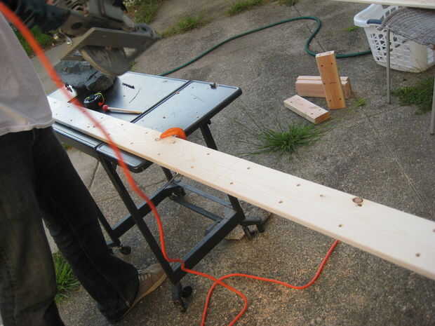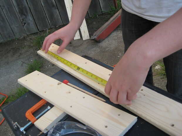 A continuación, tome la primera pieza, cortar y alinear sus agujeros con los agujeros en el nuevo borde inferior en el tablero. Haga una marca en el tablero más largo en cada extremo de la primera viga de corte. Utilizando las dos líneas que marcó como guías de corte, hacer dos cortes. Ahora debería tener un segundo rayo. Ahora, uso la primera viga que coinciden con los agujeros en el lado opuesto de la Junta y hacer marcas como de cortes adecuados por lo que son todos el mismo tamaño. Corte en estas marcas. Ahora tienes 3 vigas.