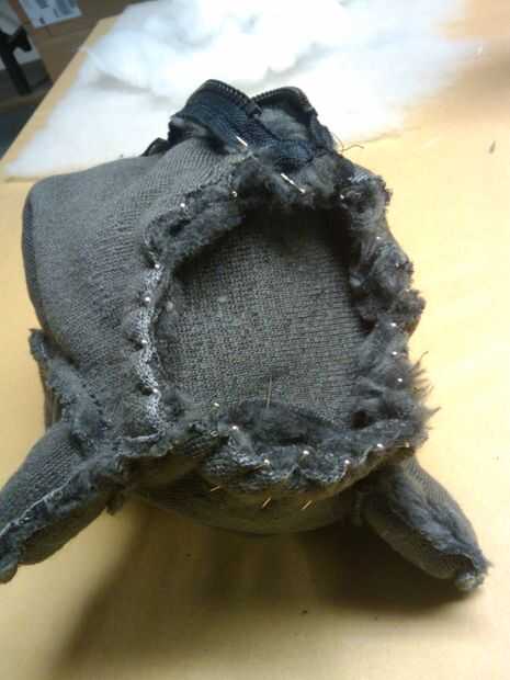 Luego pegar la cabeza (orejas primeros, nariz para arriba) en el cuello y cerca del cuello, cabeza con una roundish hecha pieza personalizada (no incluido en el diseño IKEA, pero para la cabeza mantiene su forma), coser, pero deje un pequeño espacio en la parte inferior la mitad para rellenar.