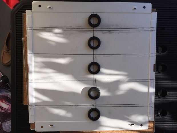 Dependiendo del tamaño de los ojales que desea utilizar, usted querrá colocar sus anillos antes de tiempo para ver donde quieres colocarlos. En la foto, verás que lo planeado en el uso de arandelas de 3/4 de pulgada. Sin embargo, debido a la cuestión del taladro, tendré que esperar hasta que la broca adecuada para utilizar estos ojales. Usando la broca de 3/4 de pulgada me había limitado a usar un ojal más pequeños que está bien... a menos que tenga tres o cuatro cables pasar por cada agujero.