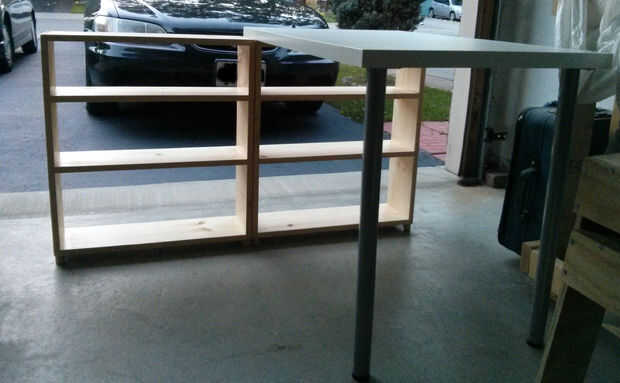 En el otro extremo de la tabla, resto la mesa en la plataforma. Hice dos estantes y optó por utilizar una configuración de L como se muestra en la imagen.