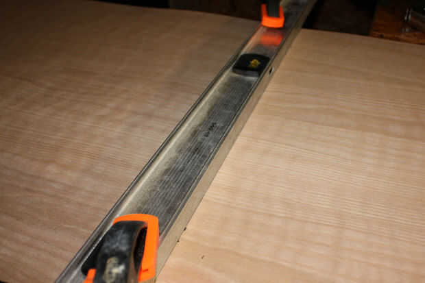 IKEA muestra esta lámpara como 20 pulgadas de diámetro. Con un poco de matemáticas podemos hacer pi x 20 = 62,8 pulgadas de circunferencia. Para estar seguro, reducirá la longitud en 64.8, pero pulgadas 62,8 es probablemente suficiente. Sujetar una tabla recta o nivel de la chapa y mi regla para cortar. Volver atrás y cortar cualquier área adicional que no es recta.