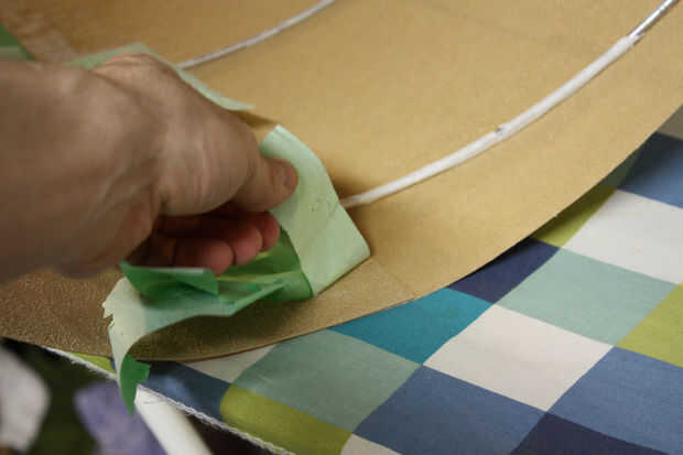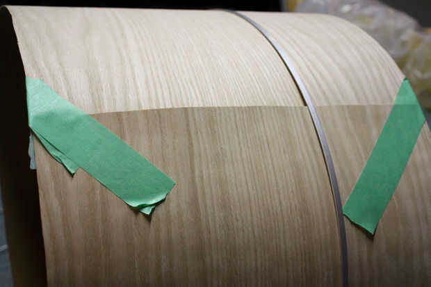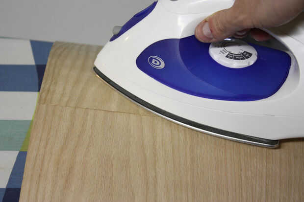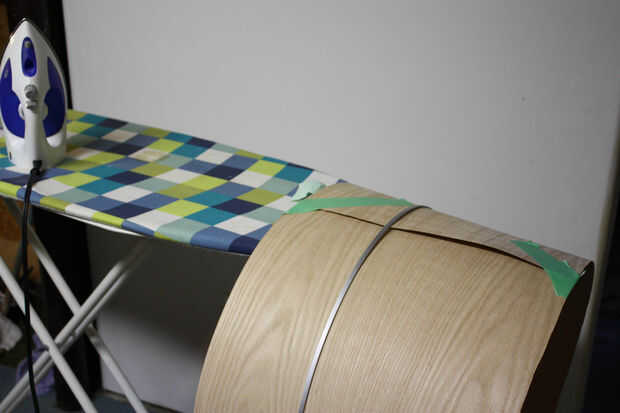 Utilizar cinta de pintor en los bordes de la superposición a las marcas de lápiz y quitar los aros exteriores. El interior del cilindro donde se produce la superposición evitar cola se pegue sobre la tabla de planchar de la cinta. Llevar el cilindro a la parte estrecha de su tabla de planchar y comience a planchar la mitad de la chapa. Medida hacia los bordes, eliminar el borde con cinta y hierro. A continuación utilice un pedazo de madera presionado la cola derretida hasta que se enfríe. Retire la cinta interior. Ahora debe tener un cilindro de chapa.