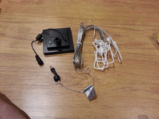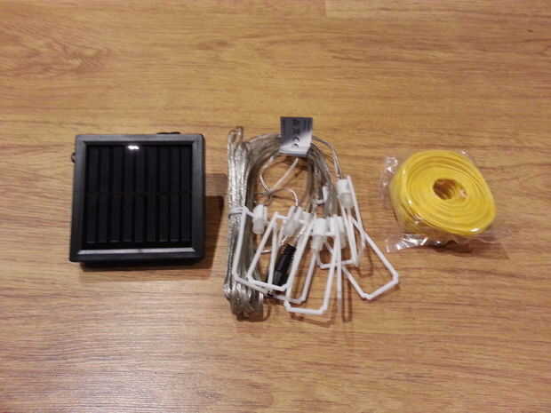 Estos pequeños equipos son grandes. Obtuvieron por $5 en especial. Incluye un panel solar de 7-8V, 2 baterías recargables de 1,2 v NiMH, algunas linternas de plástico pequeño y una cadena de LEDs en unos 10 metros de cable. El gran beneficio que es ha realmente bien elaborado. He tenido un conjunto fuera por un tiempo ahora y has guardado van. Los sellos alrededor del panel solar proporcionan protección de buen tiempo y el cable es bastante resistente.