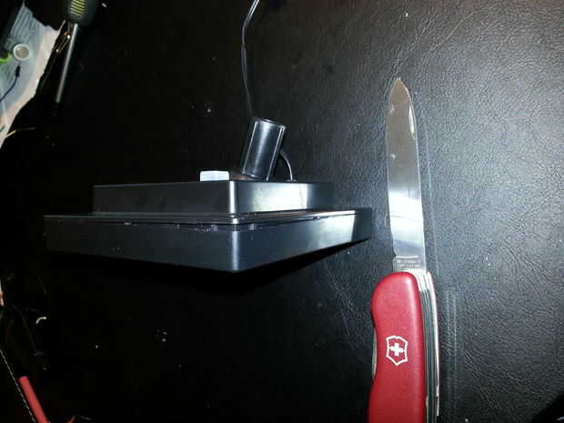 Para abrir el panel, sólo insertar la hoja (aquí con mi navaja del ejército suizo) a lo largo de la costura y palanca arriba. Debe abrirá. Trabajar su manera alrededor hasta que sale.