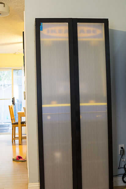 Compré dos puertas Ikea Billy para colocar al frente de la estantería para ocultar el gabinete. Cuando llegué les casa, por alguna razón, eran demasiado altos y demasiado amplia. Tal vez, mi biblioteca no es una estantería de Ikea o cambiaron el tamaño de ellos ya que tenemos la estantería hace muchos años. Me tuvieron que tomar estas puertas, corte hecho al tamaño correcto y luego volverlos a montar juntos otra vez. Desde Ikea productos generalmente no deben ser tomado aparte y hackeado, las puertas acabaron siendo muy débil ya que se mantienen unidas por espigas y pegamento. Que terminé tener que atornillar en algunas placas de reparación para que sean un poco más robusta. Por suerte la gente fina de Rockler me tiene las bisagras derecha y ellos montan bien sin problemas. Luego conseguí algunos de ésos prensa magnética a los cierres de la puerta abierta para una mirada limpia agradable desde el exterior.