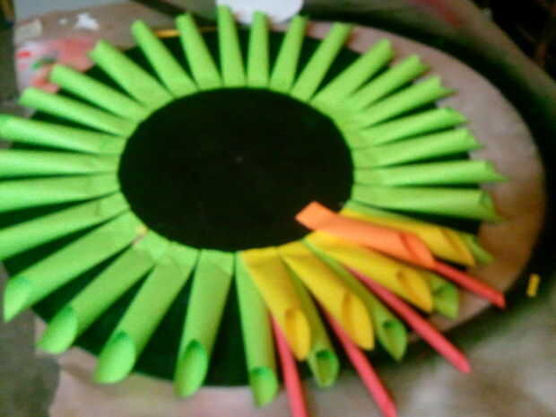 Crear un círculo con su clavo, cuerda y lápiz. Desea hacer esto otra vez para cada fila de flores que usted desea. Puesto que usted estará trabajando desde el interior del borde puede decidirlo como vas. Utilice esta línea como guía para pegar o grapar los pétalos