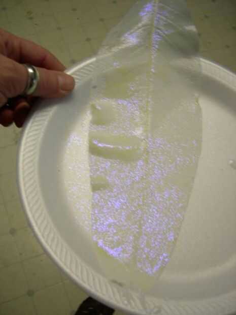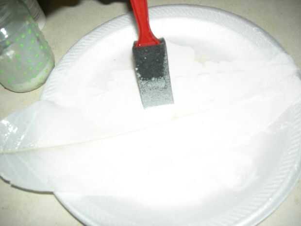Frote la mezcla de pegamento sobre las hojas con un pincel de esponja - cubrir bien el pegamento se seque y no cubra todos los agujeros en la hoja esqueleto - dab en no cepillar o usted conseguirá romper las hojas