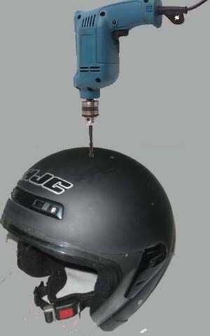 Paso # 4 que perforar el casco para hacer un pequeño hall de 2, 5mm de diámetro. Necesitamos el taladro 2,5 con el drillgun. El punto que perforar el casco está en la mitad del casco y dejar espacio para el vidrio del casco para moverse en la parte superior.