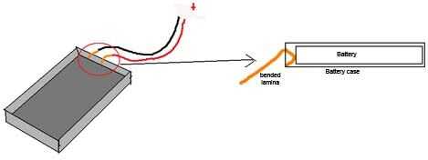Paso # 6 que preparamos el paquete de baterías. Suelda el otro par pequeño alambre al host witll caso plástico de la batería. El propósito es eliminar fácilmente la batería para su recarga. para ello necesitamos la pequeña lámina de cobre. Doblamos los dos pedazos de lámina de 5 o 3 cm por lo que la batería voluntad fácilmente conectar a ellos... Algo así como las clavijas originales de los teléfonos móviles. Nos pegue el cobre doblado con pegamento caliente.