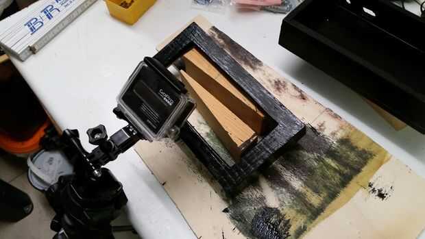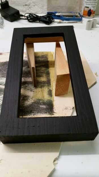 Para el falso fondo decidí hacer dos pequeñas muescas con mi herramienta rotativa en una pieza de madera contrachapada de la guarnición. De mi último proyecto que tenía la lata de spray de efecto piedra que tomé para la madera contrachapada. Creo que anuncios un efecto agradable al final.