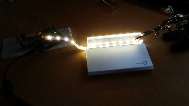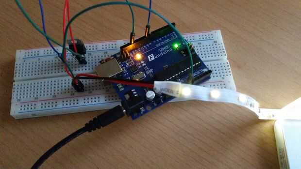 Al principio pensé que yo no puedo operar mi tira de LED que quité de un proyecto de salvarse, pero después de un poco de investigación encontré un tutorial sobre en adafruit cómo conectar una tira de 12v con un Arduino. El tutorial fue sobre una tira RGB, pero el mío es simplemente blanco, por lo que he tratado de adaptarlo a la tira que tenía - y funcionó. Esta fue la primera vez utiliza un transistor. Aquí usé el TIP120 que estaba en mi arduino starter-kit. En cuanto al código, he usado otra vez el bosquejo de LED fundido desde el IDE de Arduino. Tal vez voy a cambiar esto, pero para la prueba fue buena.