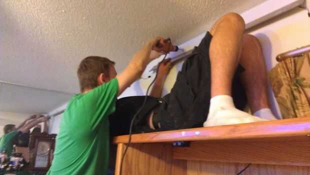 Perfore un agujero en la pared. Puesto que utilizamos 16" espaciamiento, y vigas de casas más estadounidenses son 16" aparte, se utilizó un detector de montantes (knock-knock, nudillos humanos) para encontrar y taladro en los pernos prisioneros. Si usted no tiene este espacio, se pueden utilizar tornillos de drywall, que no celebramos mucho peso, tal vez cuatro libras en la mayoría.