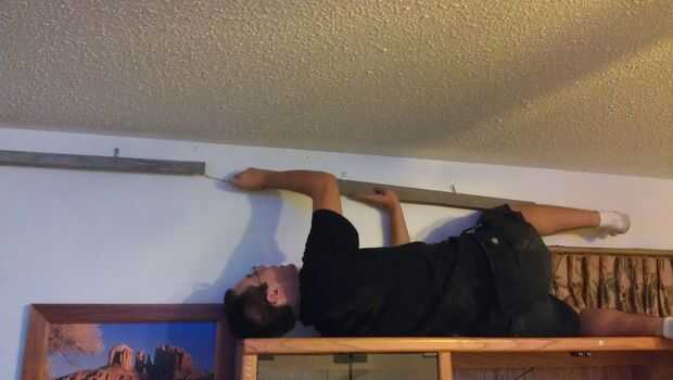 Luego coloque una pierna del codo debajo de la placa de luz-barra y tornillo en. Sólo usamos un perno en el codo, para dejar espacio para errores en la perforación de agujeros en la pared.