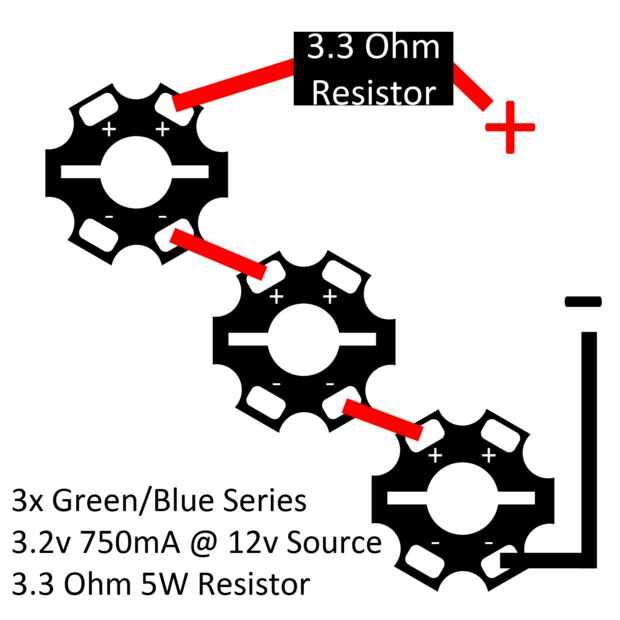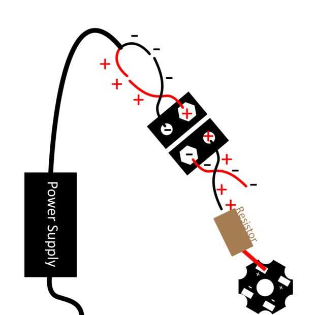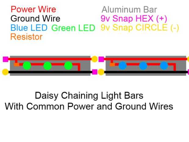 Hay caminos de tres hilos, un poder y tierra, que corren hacia abajo de la longitud de la barra de luz en los lados opuestos, y un path activo que transporta electricidad de potencia, los LEDs y el terreno. Al final de cada barra de luz son los conectores snap 9v soldadura electricidad y líneas de tierra. Estos proporcionan conexiones de extremo a extremo para Margarita. Están cableados de opuesto a cada lado ya que la polaridad cambia en cada conexión (segunda foto). Los LEDs de potencia se conectan en serie, lo que significa, positivo -> negativo -> positivo ->.,. Las imágenes ayudan a dejar esto claro.