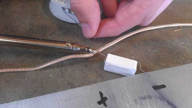 Mida y corte la longitud de cable de la longitud de la barra, generalmente 50" para una barra de 48". Usando peladores de alambre o un cuchillo Xacto, corte el revestimiento del cable de alimentación y exponer algunos de metal. Envuelva una de las patas de la resistencia alrededor de los cables expuestos y enlace con la soldadura.