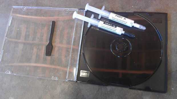 Con la Artic Alumina cerámica Epoxy termal, mezclamos lotes iguales de parte A y B en una bandeja (bandeja de CD). El epoxi se seca muy rápidamente, en menos de cinco minutos, así que recomiendo hacer sólo dos o tres LEDs al mismo tiempo.