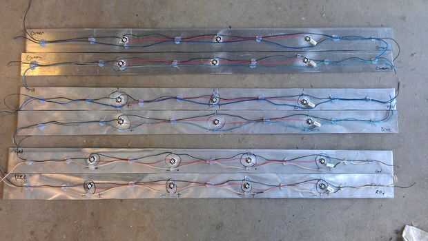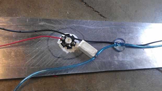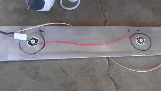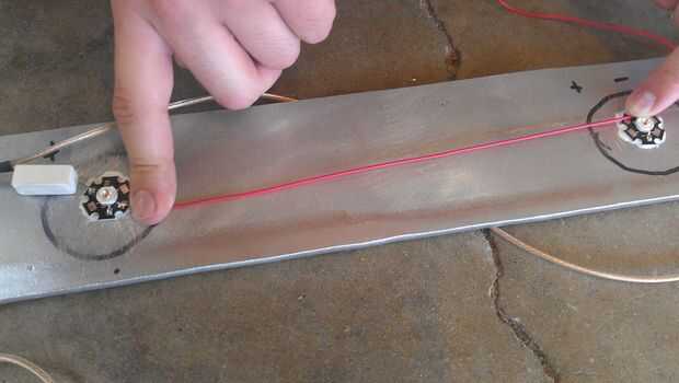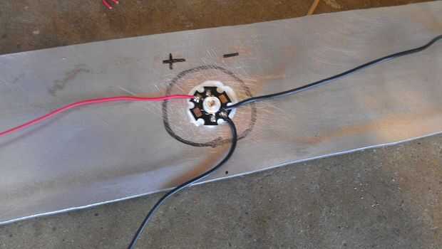 Con la resina de cerámica térmica, adherir el resto de tus LEDs a la placa de aluminio. Conectan los respectivos aspectos positivos y negativos por estañar previamente los terminales y cables y la vinculación de los juntos.