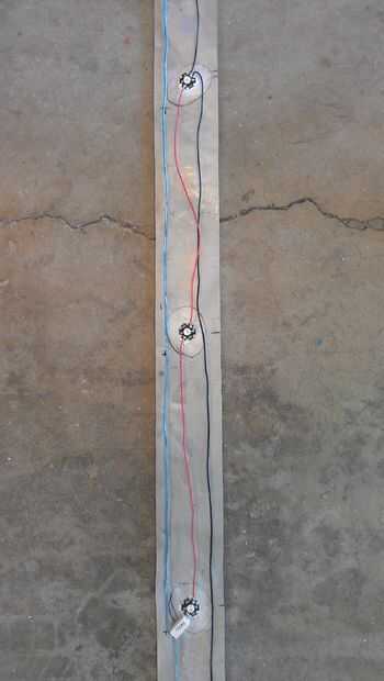 Colocar una gran gota de pegamento caliente en la placa de aluminio en un punto de la tensión de los cables. Luego coloque los cables sobre el pegamento. En la foto a continuación.