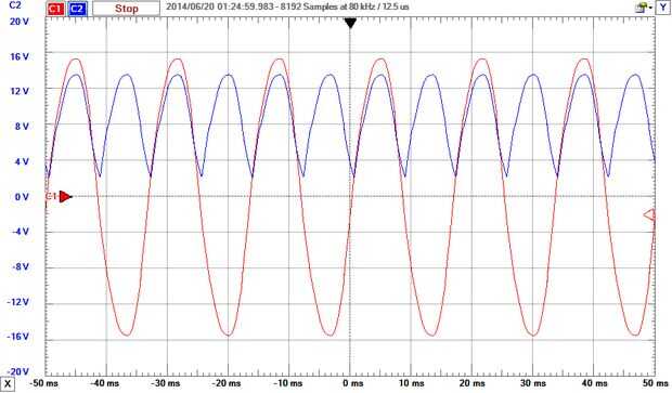 El transformador debe de salida de 12VAC. Los LEDs que compré son clasificados para 12VDC. Para convertir AC en DC, la CA debe rectificar con diodos. Pero los LED son diodos (Light Eausencia Diodes), por lo que técnicamente que este circuito funciona bien sin siquiera utilizar el puente rectificador. Sólo tiene que conectar el LED a la salida del transformador y lejos nos vamos. El problema es que los LEDs parpadean unos 50 - 60 veces por segundo con cada subida de la onda de seno la CA. Cuando la tensión negativa, el LED se apagará porque así es como funcionan los diodos. Sólo obtendrá energía a través de un diodo en un sentido no tanto. Así parpadean 50 veces por segundo, pero no son incluso en la totalidad del período, tal vez unos 40% o así. El punto es que se nota el parpadeo. El puente rectificador hace que todos los voltajes AC negativos convertir positivo, por lo que el parpadeo es dos veces tan rápido y las luces estén encendidas más tiempo (como porcentaje) por un periodo de flash. Puede ver la diferencia en la lectura del alcance o en la imagen 2. La línea roja muestra la onda de 12VAC completo va positivo y negativo. La línea azul ha sido subsanada, por lo que la tensión es siempre positiva. Si quisiéramos convertir totalmente en tensión, sería añadir un condensador electrolítico de 470uF a través de la salida de la C.C. y entonces alimente esa señal en un regulador de voltaje. La salida de es una tensión muy estable y limpia. Usé ese diseño en este Instructable.